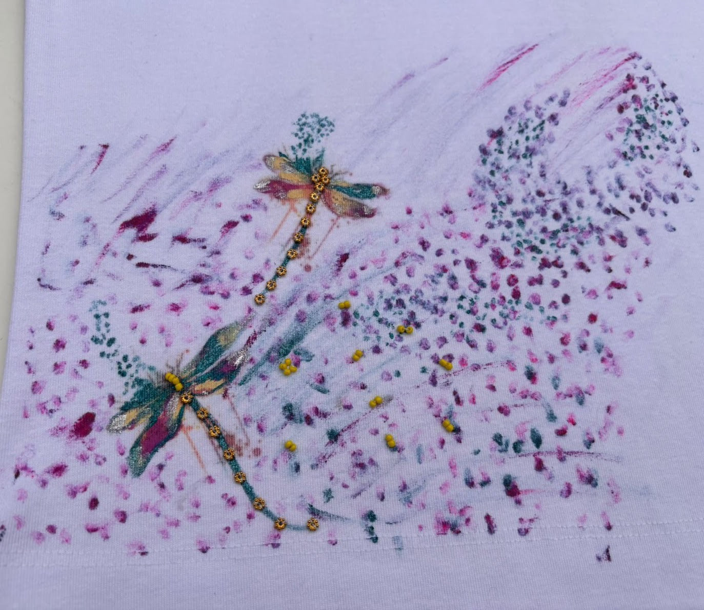 Más que una prenda, una obra de arte. Esta camiseta pintada y bordada a mano combina la delicadeza de la naturaleza con un mensaje de libertad y autenticidad.